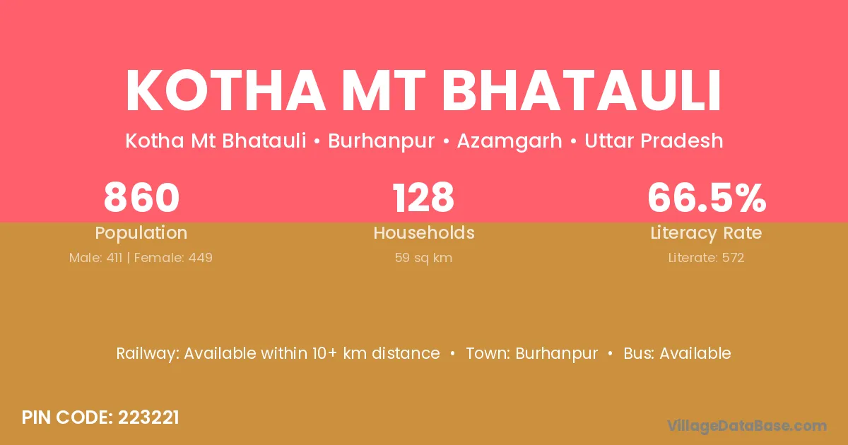 Kotha Mt Bhatauli village has a total population of 860 people, of which 411 are males and 449 are females.