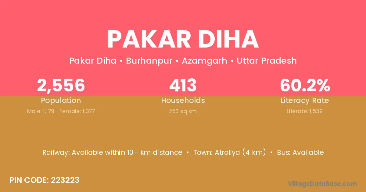 Atroliya (4 km) is the nearest town to Pakar Diha village for major economic activities and is located approximately 4 km away.