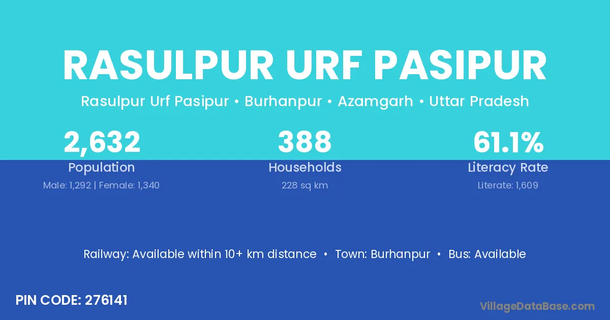 Rasulpur Urf Pasipur village has a total population of 2,632 people, of which 1,292 are males and 1,340 are females.
