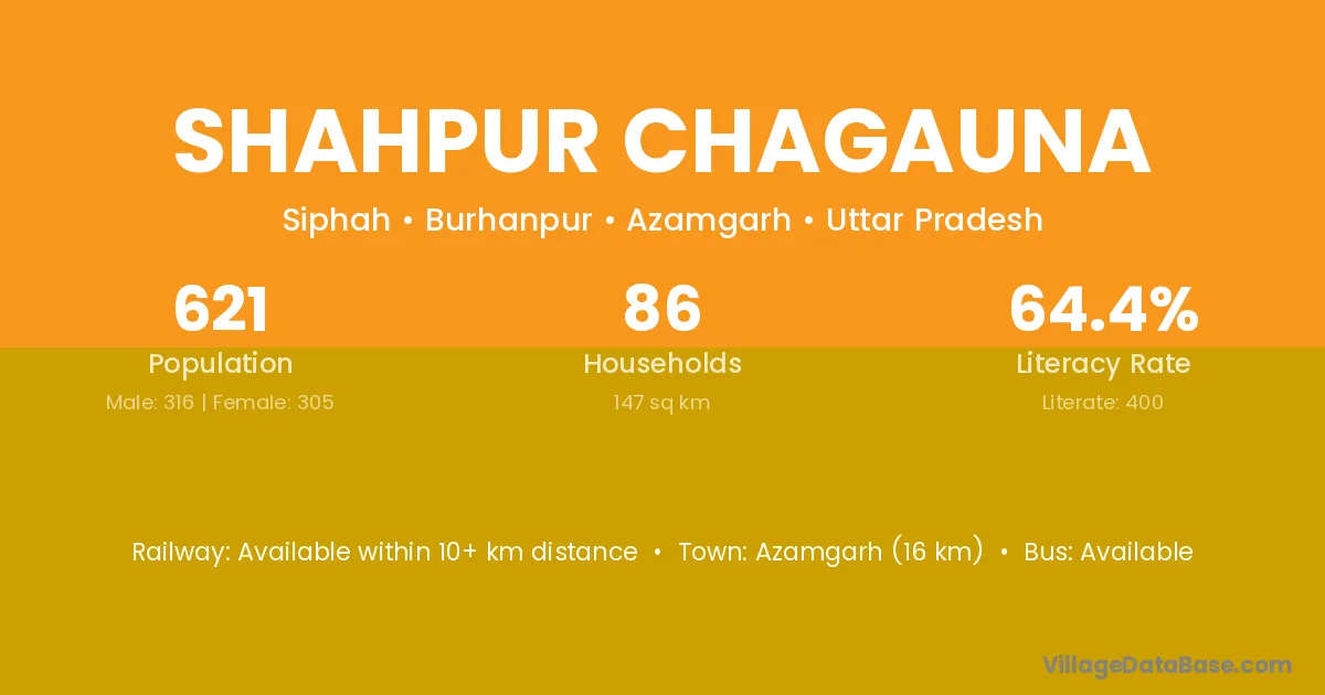 Azamgarh (16 km) is the nearest town to Shahpur Chagauna village for major economic activities and is located approximately 16 km away.