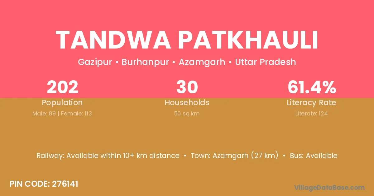 Azamgarh (27 km) is the nearest town to Tandwa Patkhauli village for major economic activities and is located approximately 27 km away.