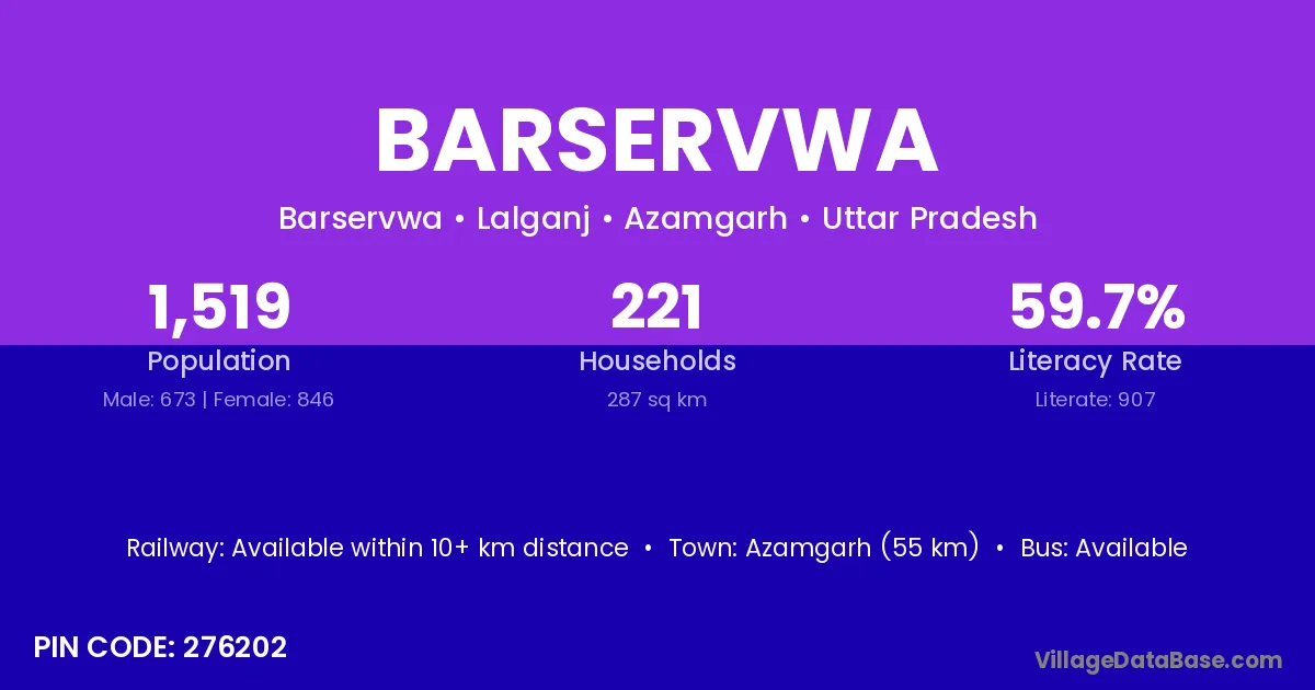 Azamgarh (55 km) is the nearest town to Barservwa village for major economic activities and is located approximately 55 km away.