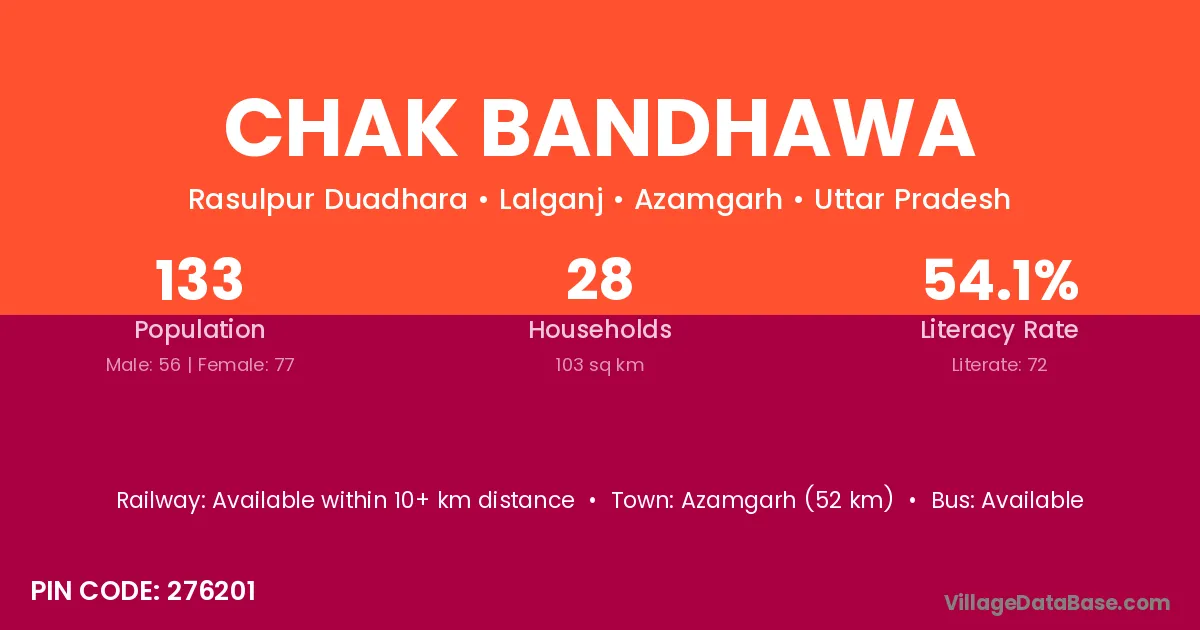 Azamgarh (52 km) is the nearest town to Chak Bandhawa village for major economic activities and is located approximately 52 km away.