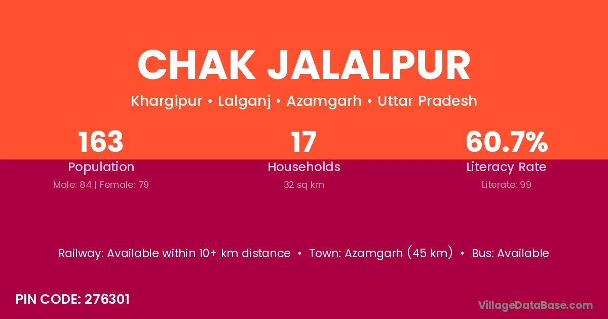 Azamgarh (45 km) is the nearest town to Chak Jalalpur village for major economic activities and is located approximately 45 km away.