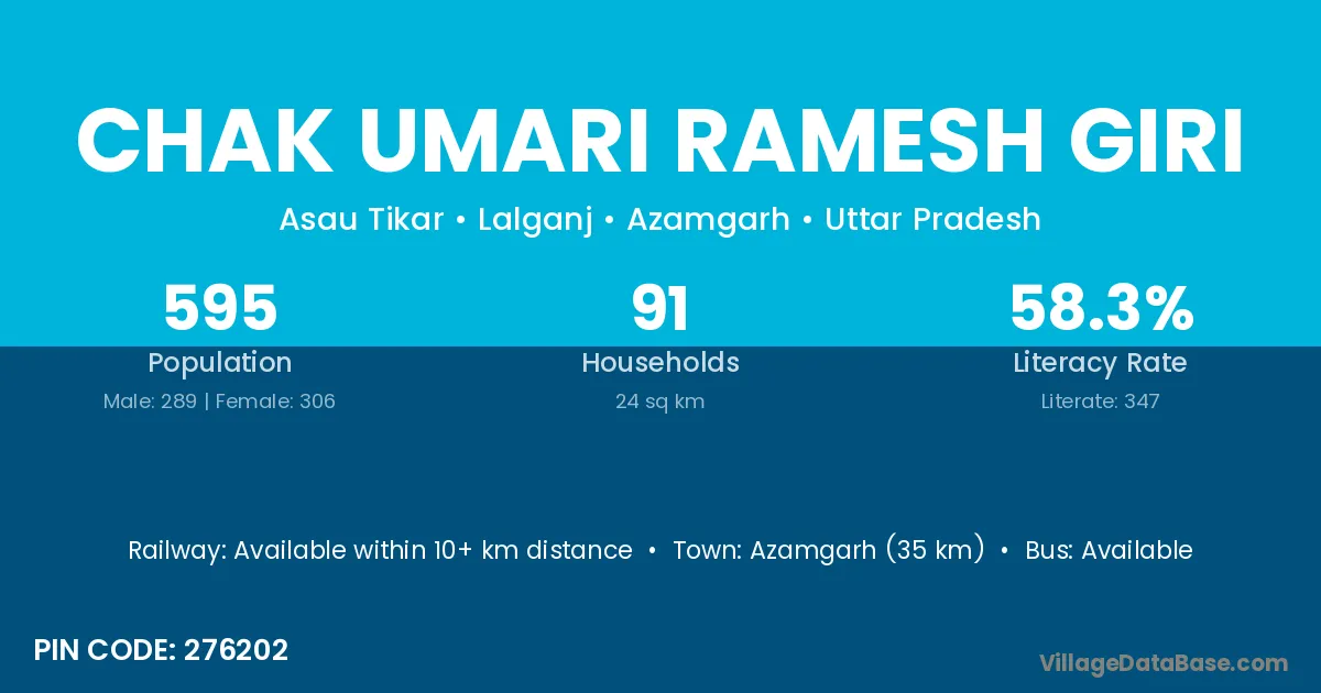 Azamgarh (35 km) is the nearest town to Chak Umari Ramesh Giri village for major economic activities and is located approximately 35 km away.