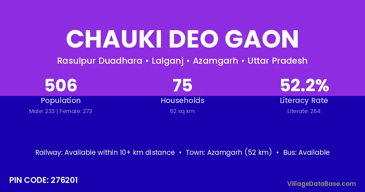 Azamgarh (52 km) is the nearest town to Chauki Deo Gaon village for major economic activities and is located approximately 52 km away.