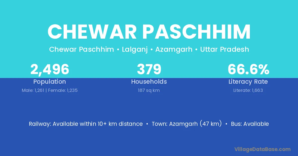 Azamgarh (47 km) is the nearest town to Chewar Paschhim village for major economic activities and is located approximately 47 km away.