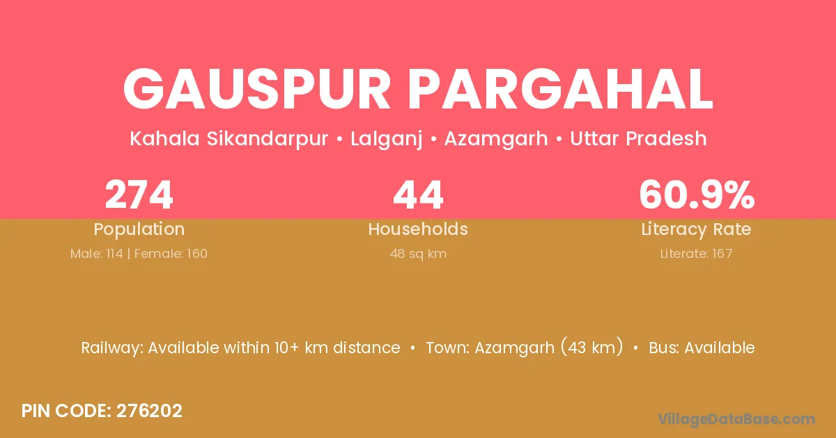 Azamgarh (43 km) is the nearest town to Gauspur Pargahal village for major economic activities and is located approximately 43 km away.