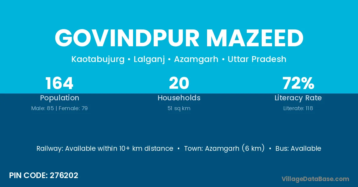 Azamgarh (6 km) is the nearest town to Govindpur Mazeed village for major economic activities and is located approximately 6 km away.