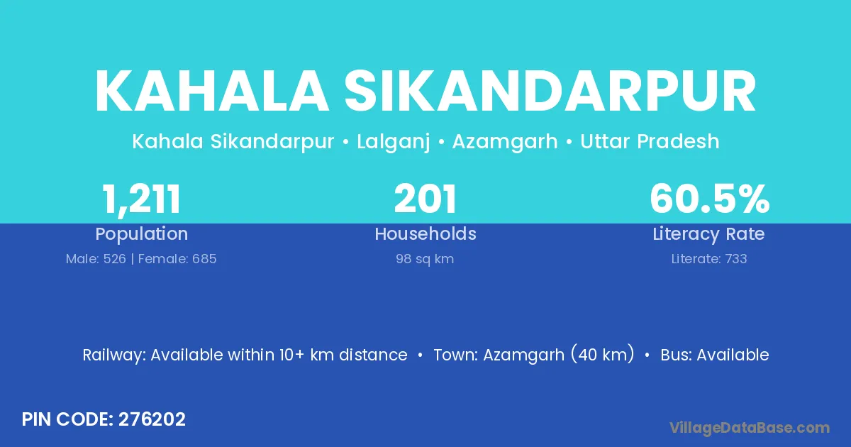 Azamgarh (40 km) is the nearest town to Kahala Sikandarpur village for major economic activities and is located approximately 40 km away.