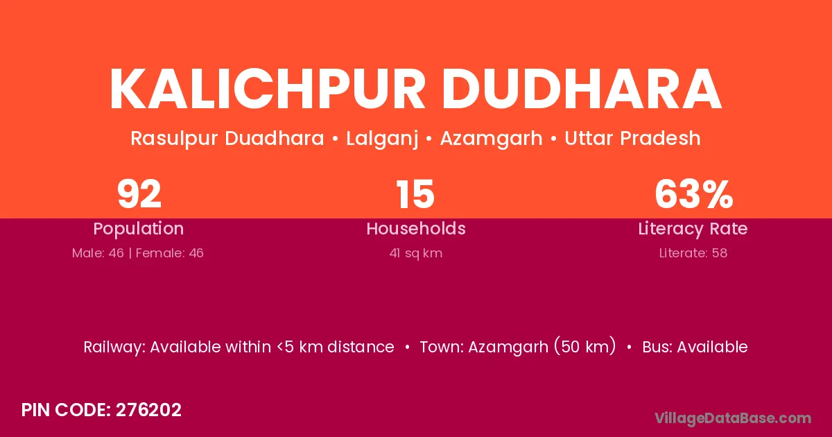 Azamgarh (50 km) is the nearest town to Kalichpur Dudhara village for major economic activities and is located approximately 50 km away.