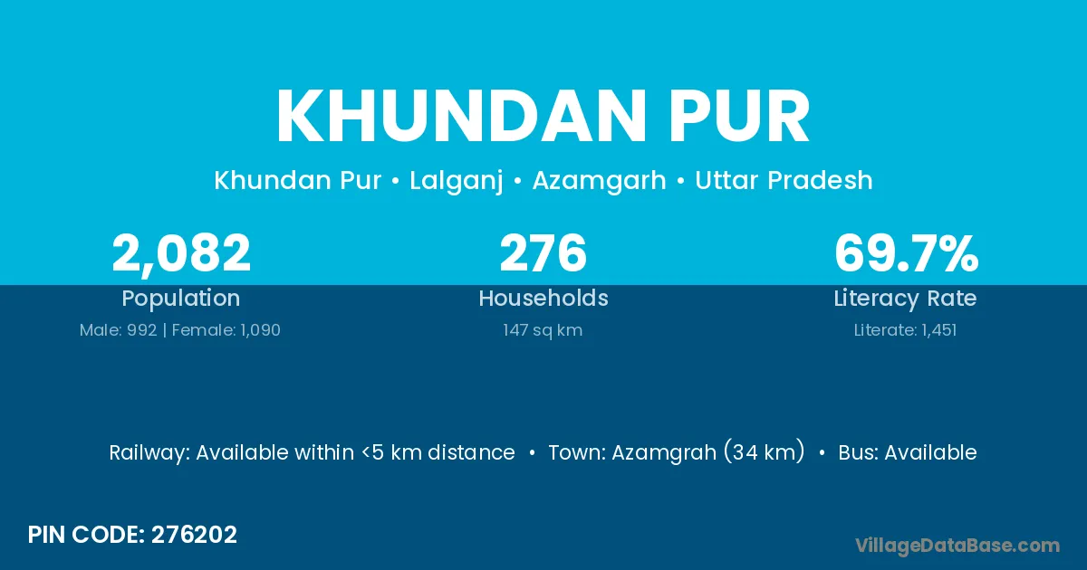 Azamgrah (34 km) is the nearest town to Khundan Pur village for major economic activities and is located approximately 34 km away.