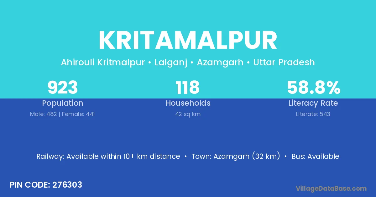 Azamgarh (32 km) is the nearest town to Kritamalpur village for major economic activities and is located approximately 32 km away.