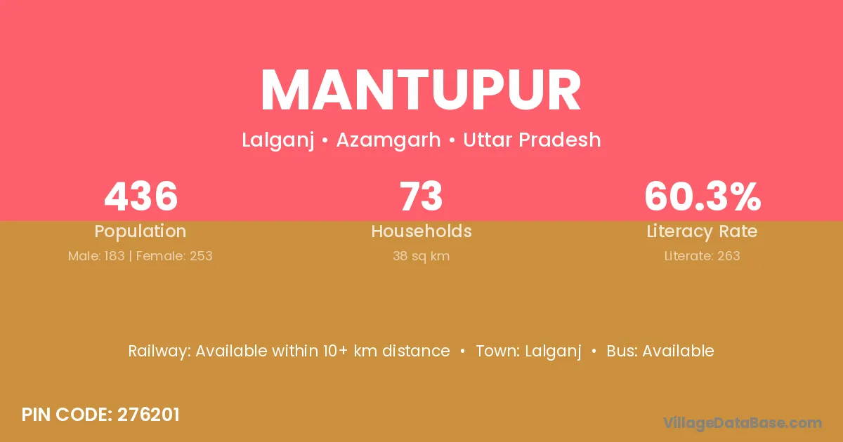 Mantupur village has a total population of 436 people, of which 183 are males and 253 are females.