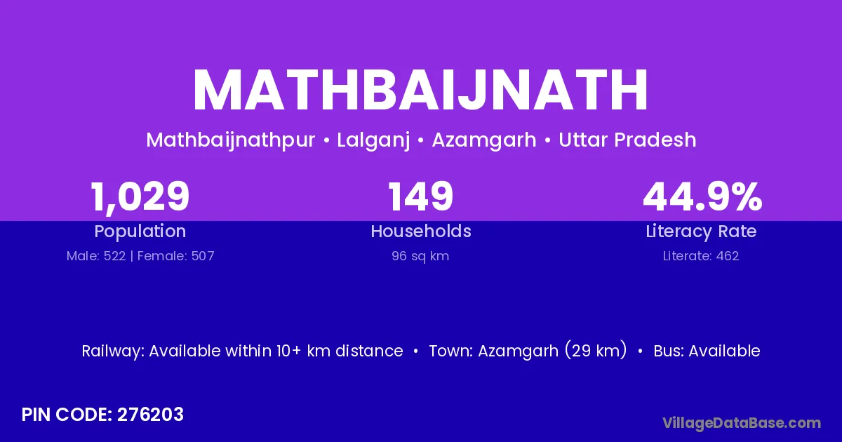 Azamgarh (29 km) is the nearest town to Mathbaijnath village for major economic activities and is located approximately 29 km away.