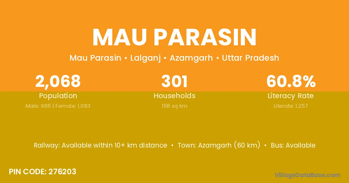 Azamgarh (60 km) is the nearest town to Mau Parasin village for major economic activities and is located approximately 60 km away.