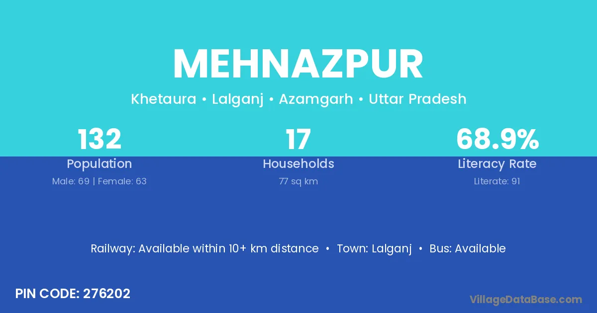 Mehnazpur village has a total population of 132 people, of which 69 are males and 63 are females.