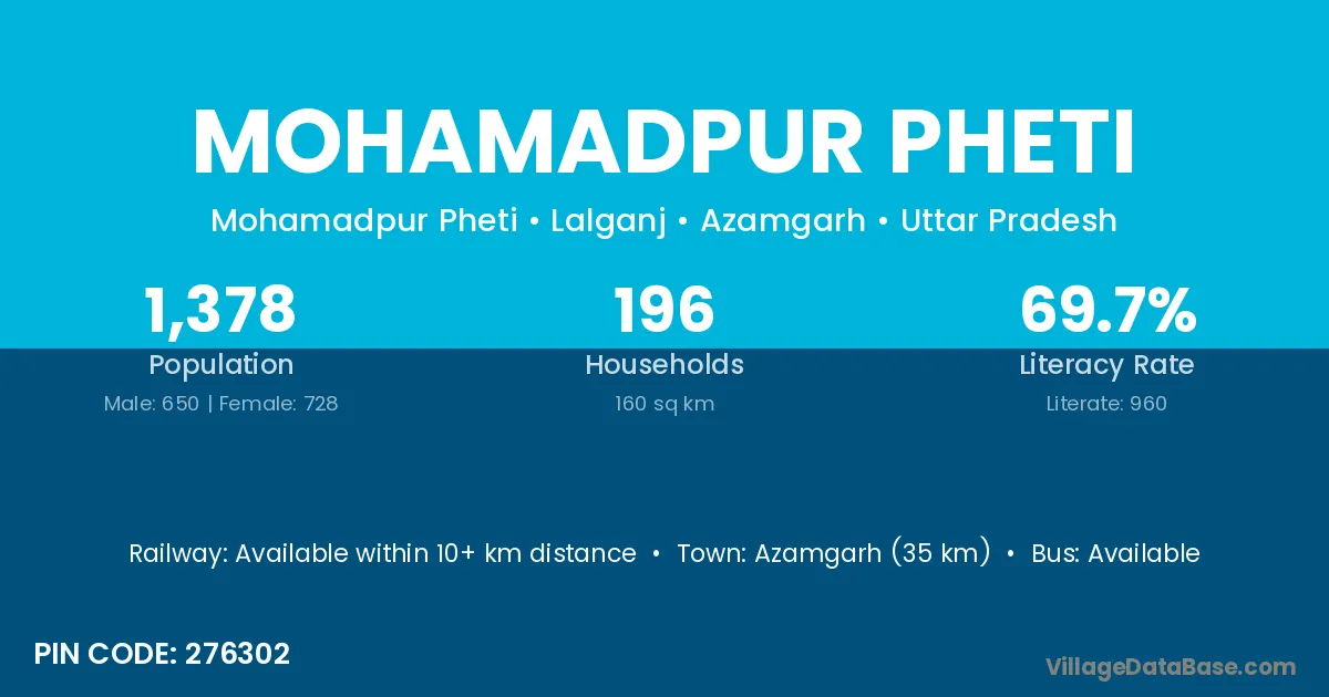 Azamgarh (35 km) is the nearest town to Mohamadpur Pheti village for major economic activities and is located approximately 35 km away.