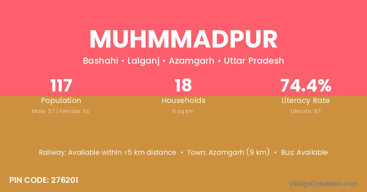 Azamgarh (9 km) is the nearest town to Muhmmadpur village for major economic activities and is located approximately 9 km away.
