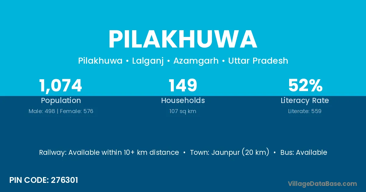 Jaunpur (20 km) is the nearest town to Pilakhuwa village for major economic activities and is located approximately 20 km away.