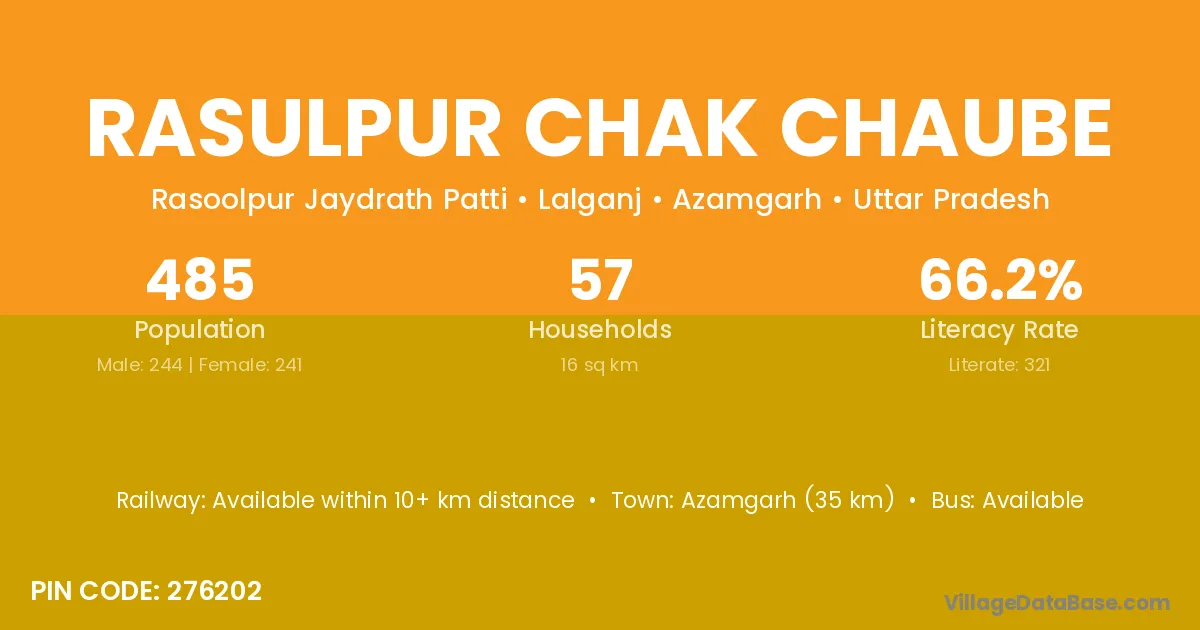 Rasulpur Chak Chaube village has a total population of 485 people, of which 244 are males and 241 are females.