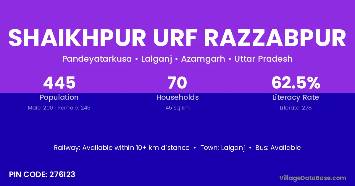 Shaikhpur Urf Razzabpur village has a total population of 445 people, of which 200 are males and 245 are females.
