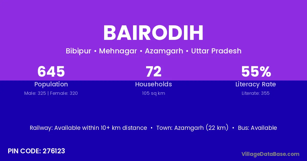 Azamgarh (22 km) is the nearest town to Bairodih village for major economic activities and is located approximately 22 km away.