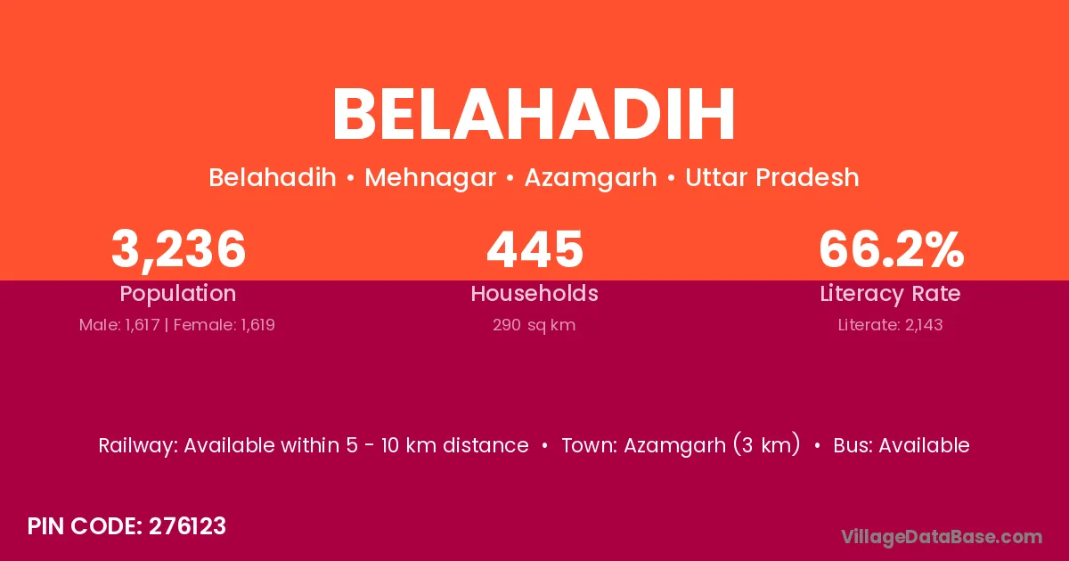 Azamgarh (3 km) is the nearest town to Belahadih village for major economic activities and is located approximately 3 km away.