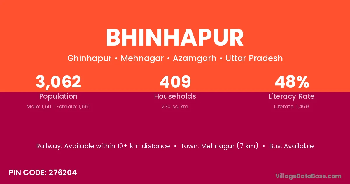 Mehnagar (7 km) is the nearest town to Bhinhapur village for major economic activities and is located approximately 7 km away.