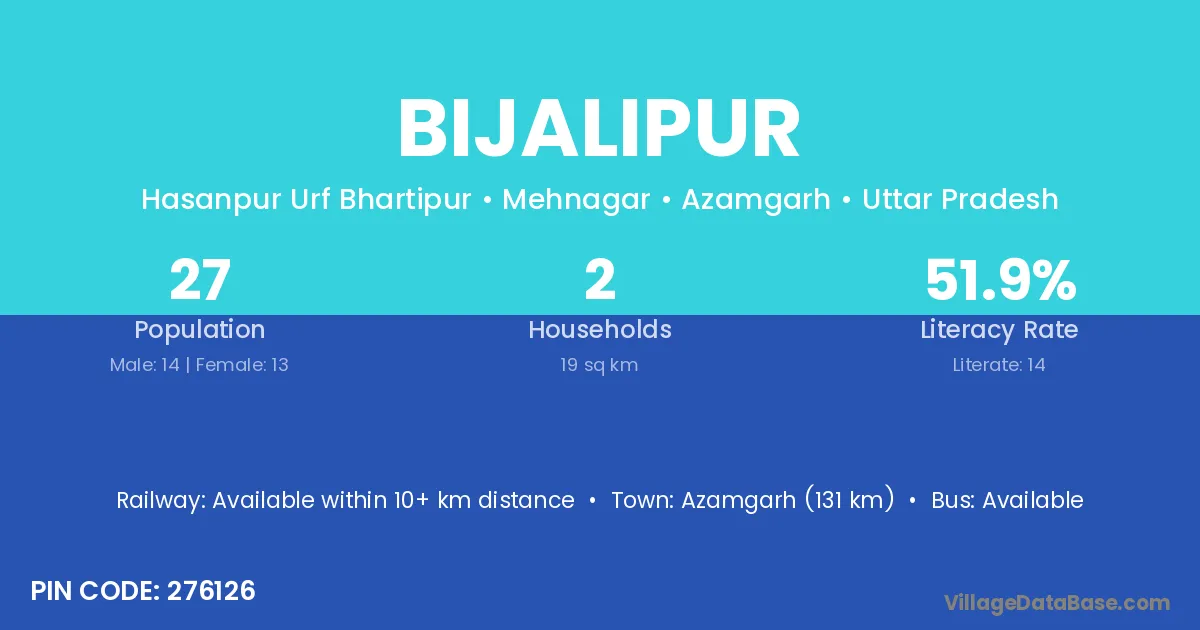 Azamgarh (131 km) is the nearest town to Bijalipur village for major economic activities and is located approximately 131 km away.