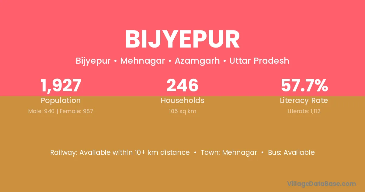 Bijyepur village has a total population of 1,927 people, of which 940 are males and 987 are females.