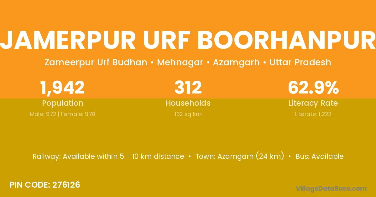 Jamerpur Urf Boorhanpur village has a total population of 1,942 people, of which 972 are males and 970 are females.