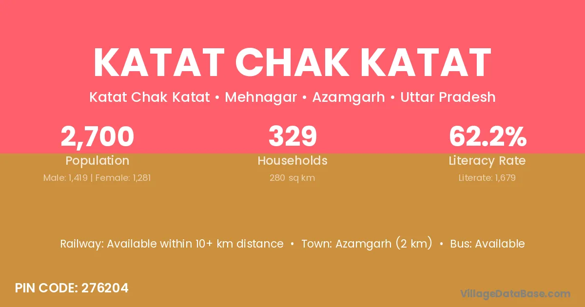 Azamgarh (2 km) is the nearest town to Katat Chak Katat village for major economic activities and is located approximately 2 km away.