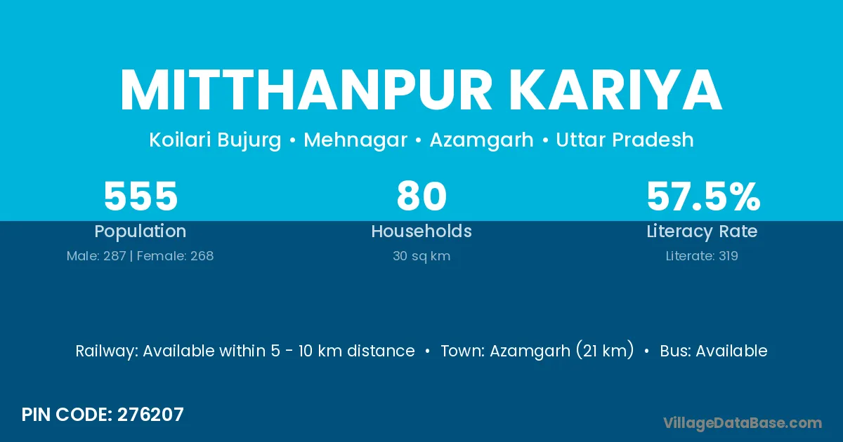 Azamgarh (21 km) is the nearest town to Mitthanpur Kariya village for major economic activities and is located approximately 21 km away.