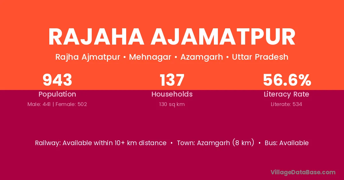 Azamgarh (8 km) is the nearest town to Rajaha Ajamatpur village for major economic activities and is located approximately 8 km away.