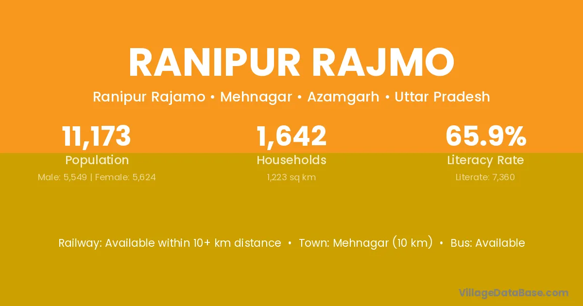 Mehnagar (10 km) is the nearest town to Ranipur Rajmo village for major economic activities and is located approximately 10 km away.