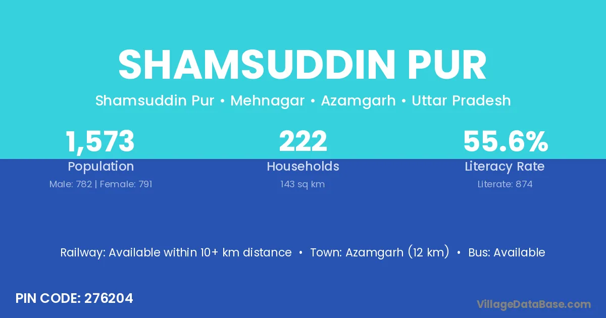 Azamgarh (12 km) is the nearest town to Shamsuddin Pur village for major economic activities and is located approximately 12 km away.