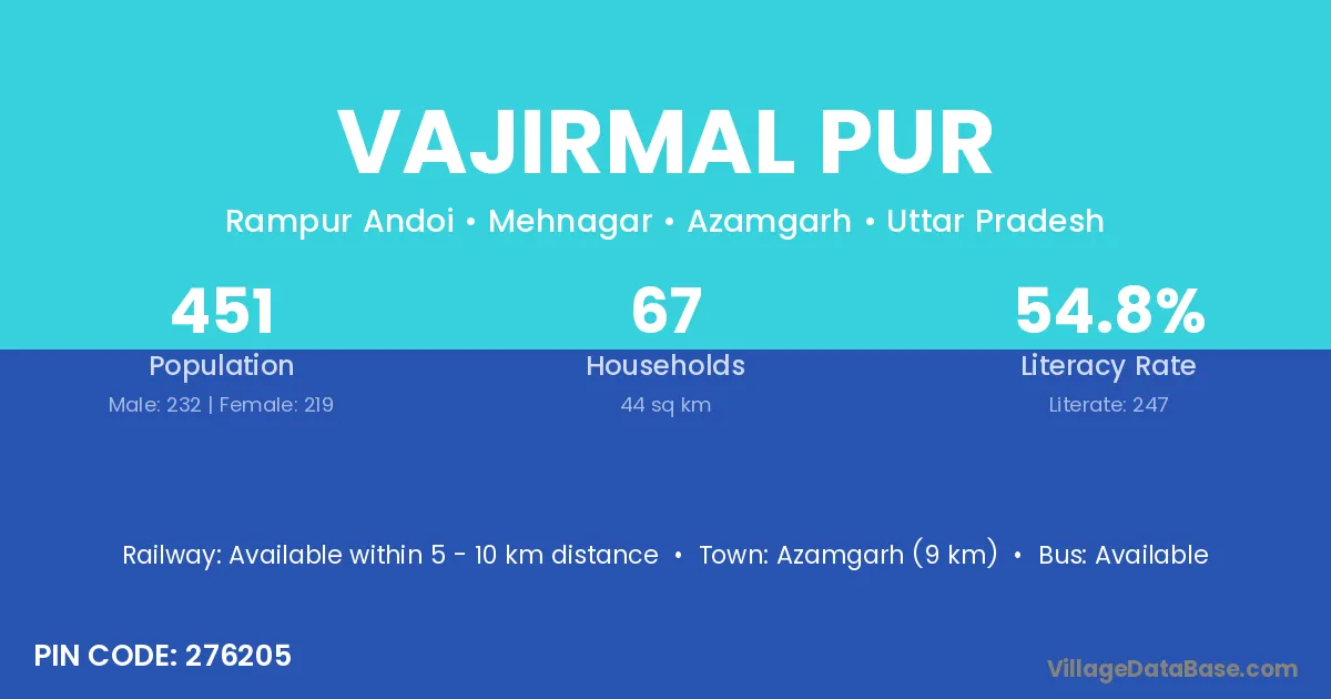 Vajirmal Pur village has a total population of 451 people, of which 232 are males and 219 are females.