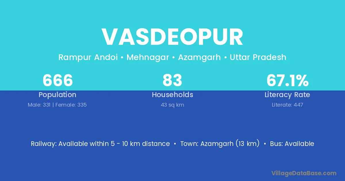 Azamgarh (13 km) is the nearest town to Vasdeopur village for major economic activities and is located approximately 13 km away.