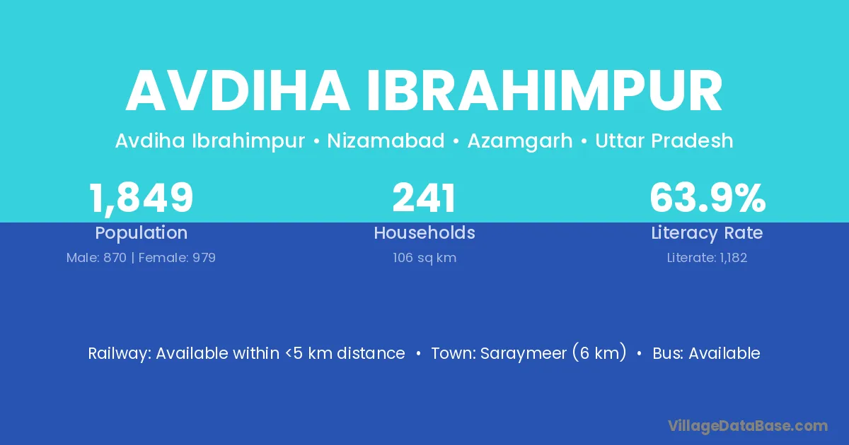 Avdiha Ibrahimpur village has a total population of 1,849 people, of which 870 are males and 979 are females.