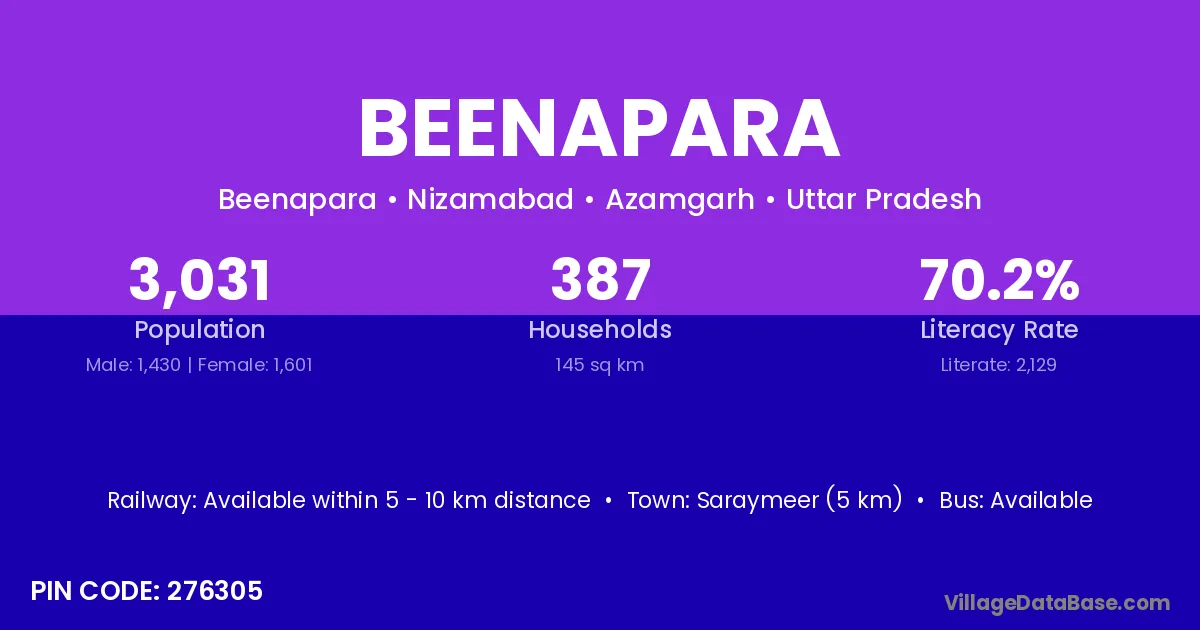 Saraymeer (5 km) is the nearest town to Beenapara village for major economic activities and is located approximately 5 km away.