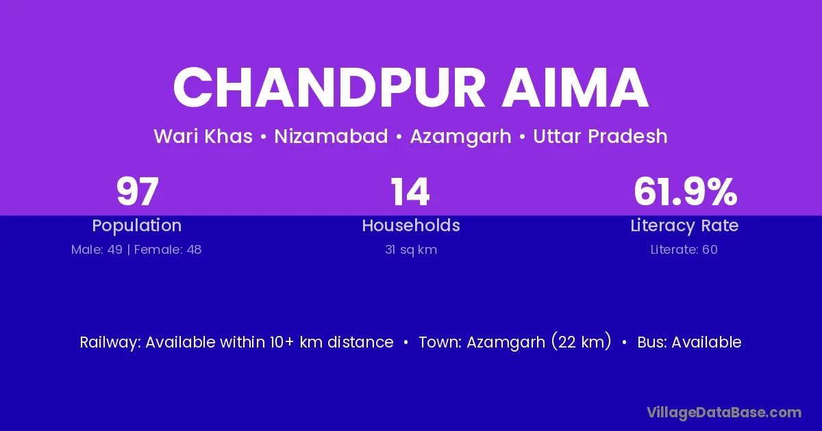 Azamgarh (22 km) is the nearest town to Chandpur Aima village for major economic activities and is located approximately 22 km away.