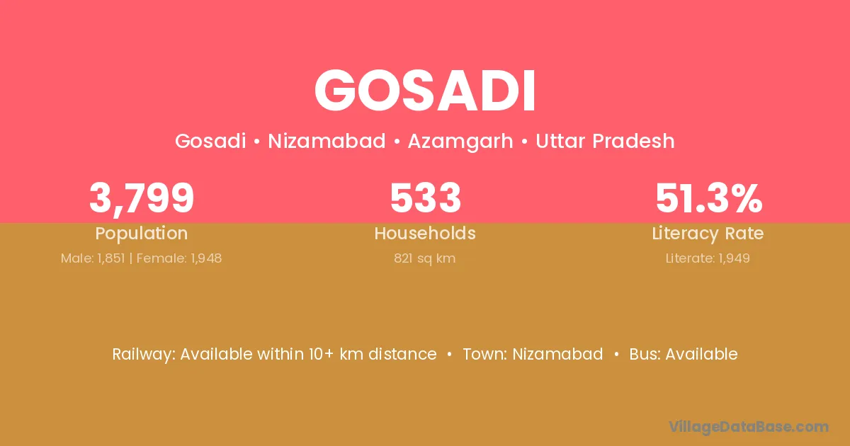 Gosadi village has a total population of 3,799 people, of which 1,851 are males and 1,948 are females.