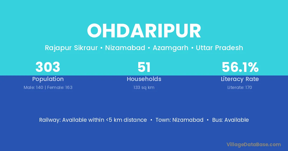 Ohdaripur village has a total population of 303 people, of which 140 are males and 163 are females.