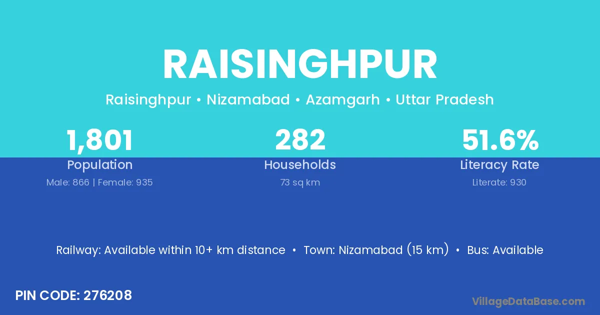 Nizamabad (15 km) is the nearest town to Raisinghpur village for major economic activities and is located approximately 15 km away.