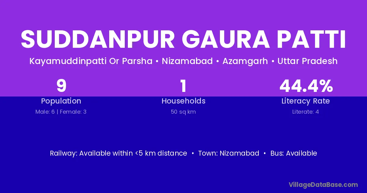 Suddanpur Gaura Patti village has a total population of 9 people, of which 6 are males and 3 are females.
