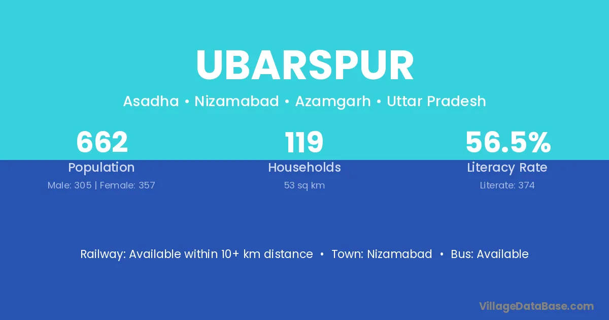 The literacy rate of Ubarspur village is 56.50%. Male literacy stands at 64.26% and female literacy at 49.86%.