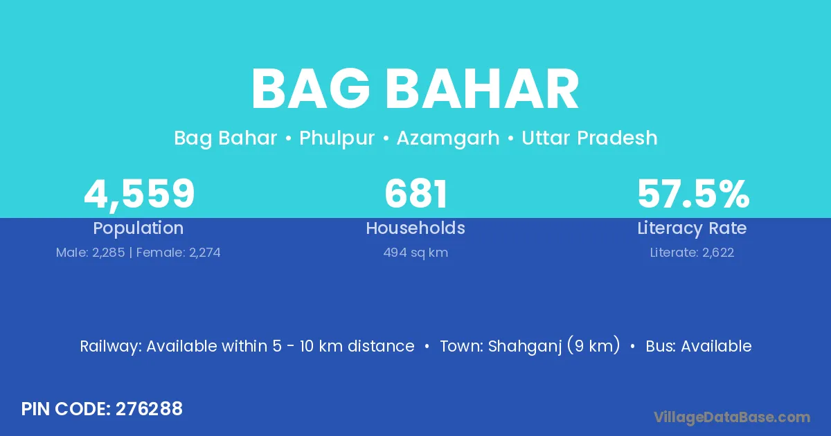 Shahganj (9 km) is the nearest town to Bag Bahar village for major economic activities and is located approximately 9 km away.
