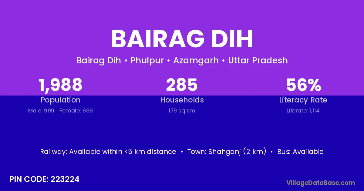 Shahganj (2 km) is the nearest town to Bairag Dih village for major economic activities and is located approximately 2 km away.