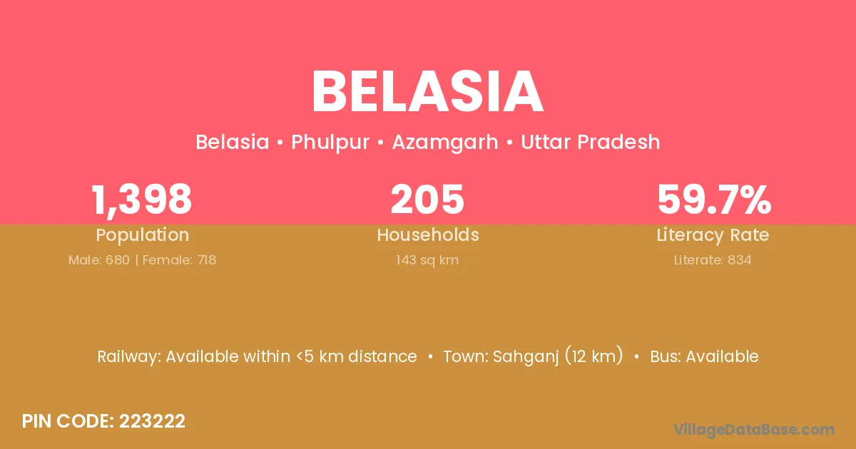 Belasia village has a total population of 1,398 people, of which 680 are males and 718 are females.